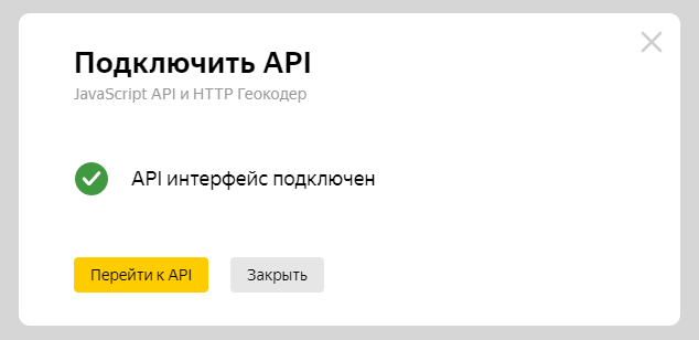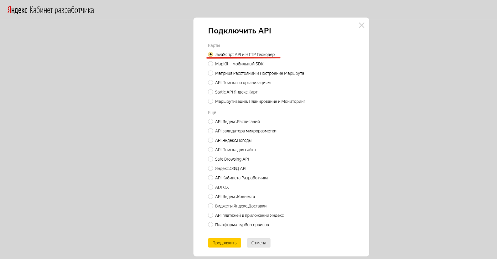 2. Во всплывающем окне выберите сервис «JavaScript API и HTTP Геокодер».