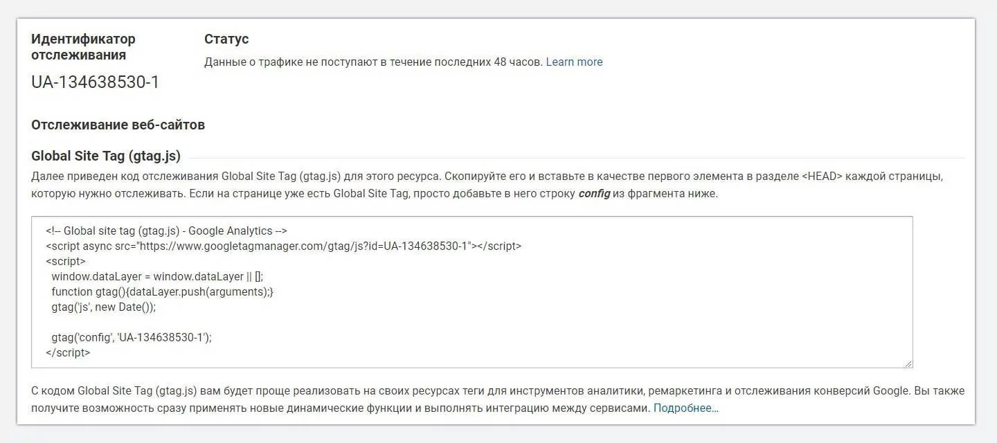 - В следующем окне вы получите идентификатор отслеживания. Это скрипт, который будет передавать в систему аналитики все действия посетителей вашего сайта.