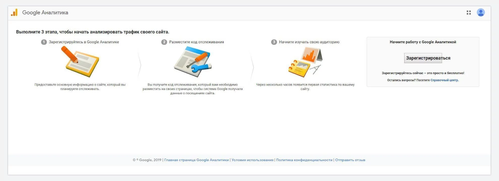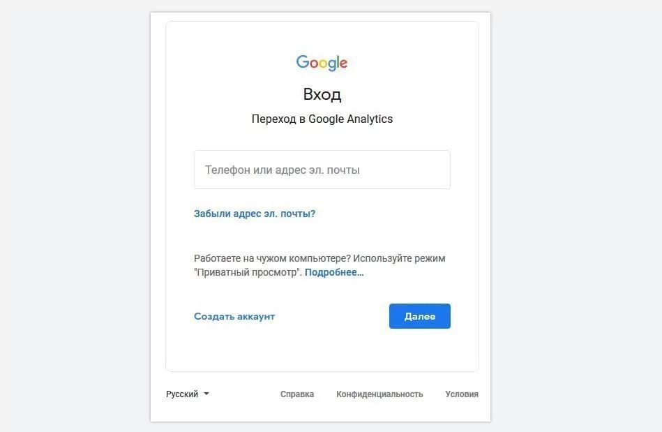 1. Зайдите в свой аккаунт или создайте новый на главной странице https://analytics.google.com/.