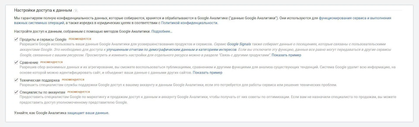 Наш опыт показывает, что можно оставить галочку «Специалисты по аккаунтам». В таком случае на почту периодически будут приходить письма с предложением увеличить количество клиентов с помощью платной рекламы — сервисы контекстных объявлений и аналитики в Google связаны. Это подходит, если вы рассматриваете такой способ продвижения для своего сайта.