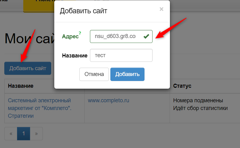 1. На сайте PhoneTrack.ru перейдите в «Мои сайты» ⤑ Добавить новый сайт. Введите адрес сайта.