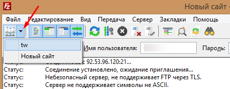 В дальнейшем вы сможете подключаться к указанному серверу одним кликом, просто выбрав заданное имя в списке сохраненных сайтов:
