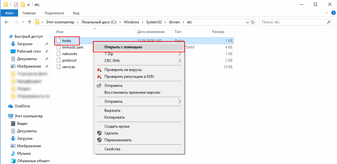 В папке etc кликните правой кнопкой мыши на файле hosts, выберите «Открыть с помощью» и далее выберите «Блокнот»: