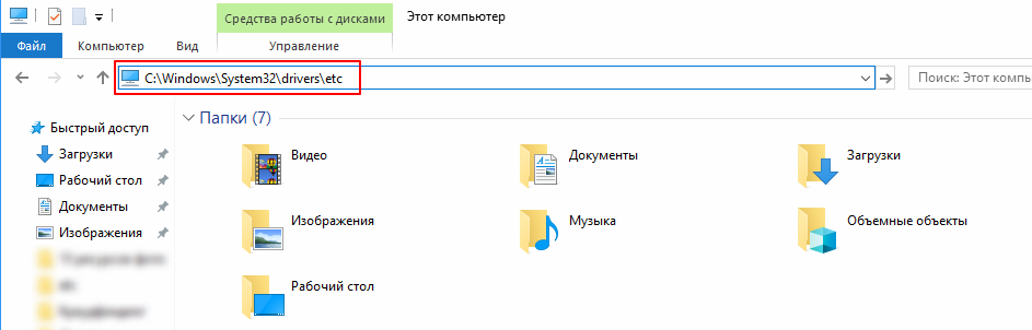 Перейти в «Мой компьютер» -> Локальный диск С -> Windows -> System32 -> drivers -> etc либо вставить нужный путь в адресную строку проводника: