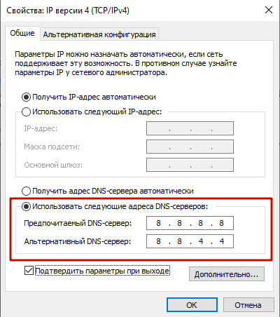 - На вкладке «Общие» выберите пункт «Использовать следующие адреса DNS-серверов» и введите нужные DNS-адреса в поля «Предпочитаемый DNS-сервер» и «Альтернативный DNS-cepвep». В зависимости от выбранного провайдера DNS, второе поле может оставаться пустым.