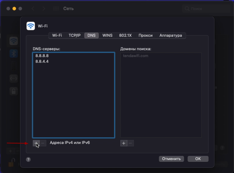 - В появившемся окне перейдите во вкладку «DNS», нажмите значок «+» и введите IP-адрес нужного DNS-сервера.