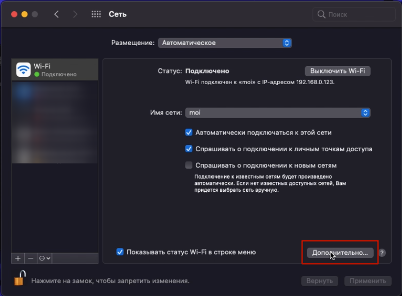 Для смены DNS-серверов на устройствах под управлением macOS необходимо перейти в настройки сетевого подключения и указать IP-адрес DNS-сервера.