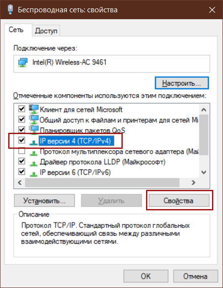 - В списке компонентов найдите и выделите пункт «IP версии 4 (TCP/IPv4)» и нажмите кнопку «Свойства».