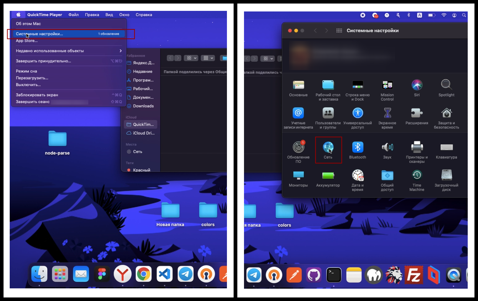 - Откройте меню Apple (иконка яблока) и выберите пункт «Системные настройки». После перейдите в меню «Сеть».