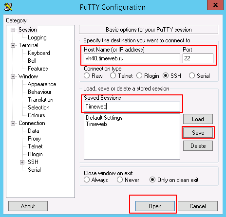 Запустите PuTTY и укажите в окне настроек необходимые реквизиты для соединения с сервером: