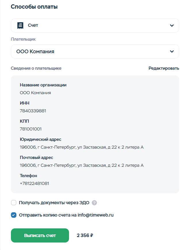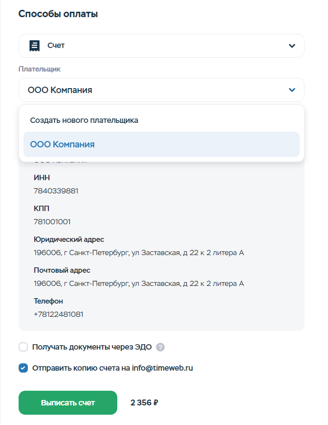 Создать нового плательщика или изменить данные уже созданного вы можете в панели управления аккаунтом, в разделе «Оплата».