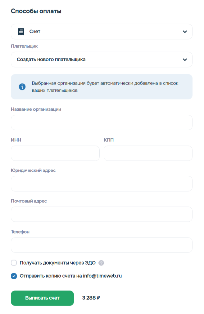 - Заполните форму и нажмите «Выписать счет».