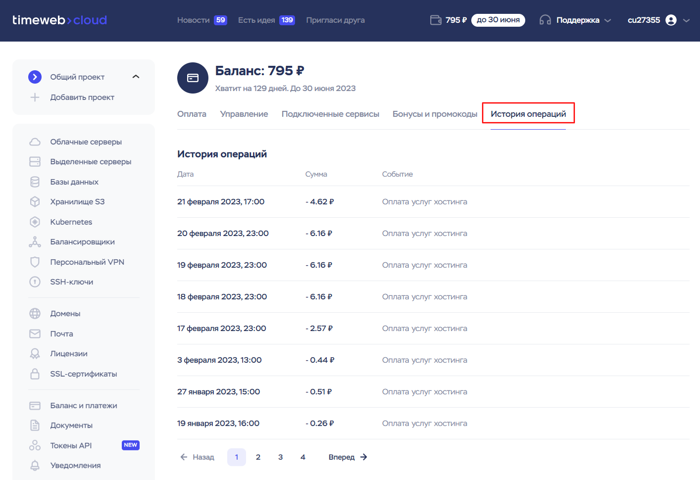 Посмотреть историю списаний можно в разделе «Баланс и платежи» — «История операций»: