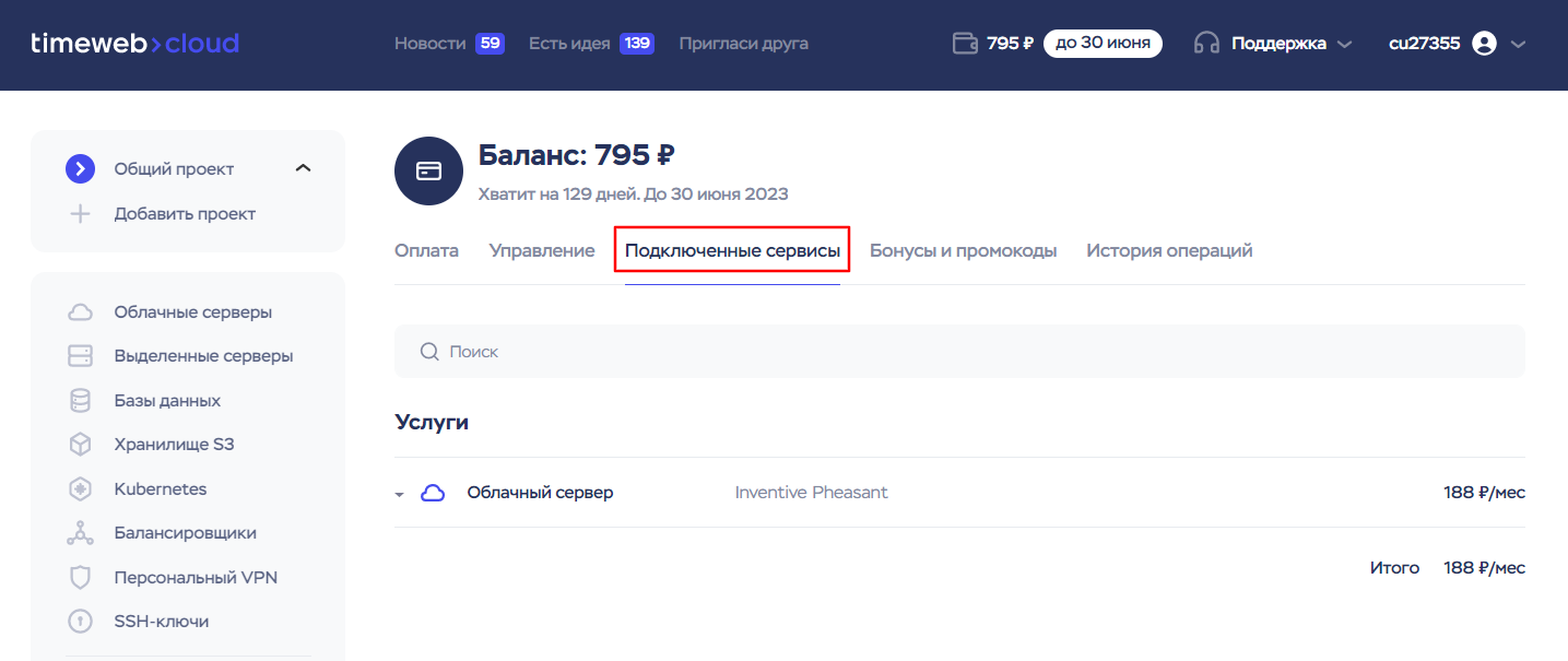 Оплата в панели timeweb.cloud/my