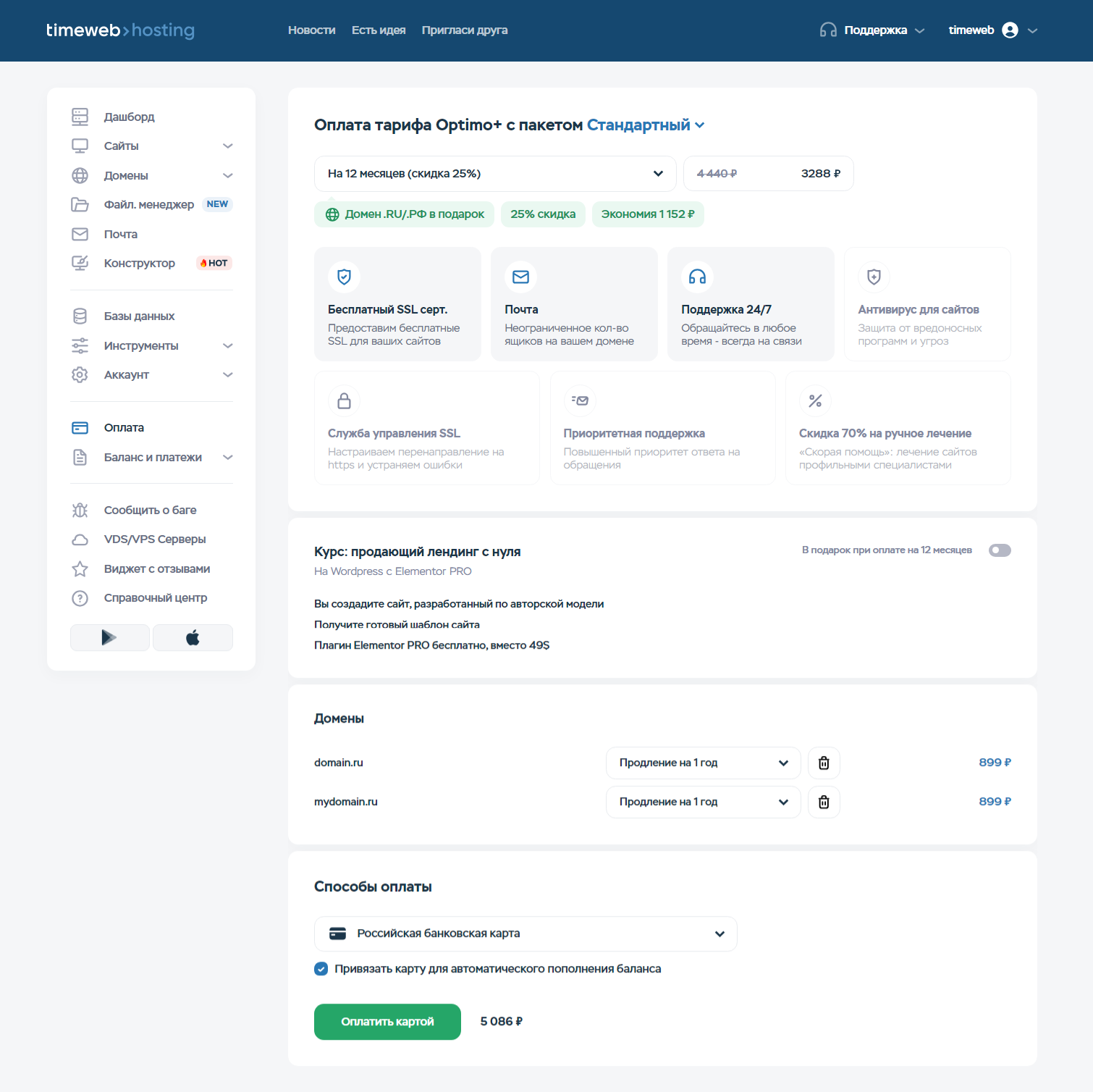 Оплата в панели hosting.timeweb.ru