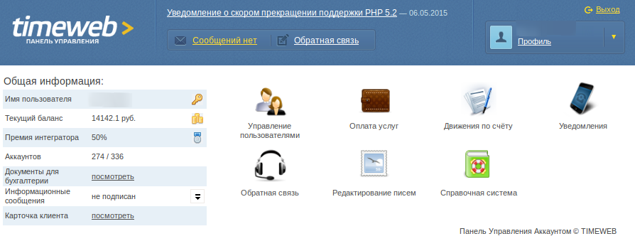 Для удобного управления услугами и клиентами интегратора создана специальная панель. Она доступна по адресу cp.timeweb.ru. После авторизации вы попадаете на главную страницу.