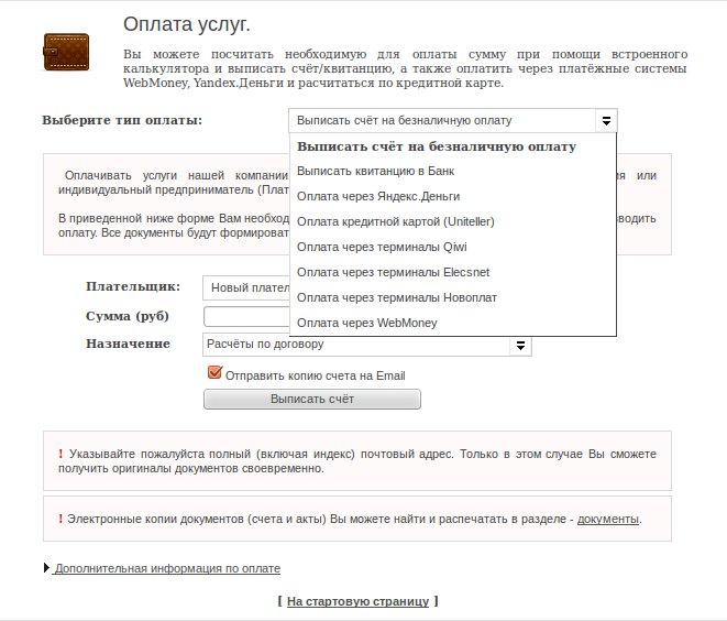 В разделе «Оплата услуг» вы сможете внести средства на баланс, выбрав удобный способ оплаты в выпадающем списке.