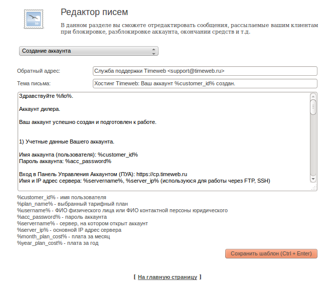 Раздел «Редактор писем» позволяет адаптировать шаблоны писем, которые получают Ваши клиенты. Тип письма вы можете выбрать сверху в выпадающем списке.