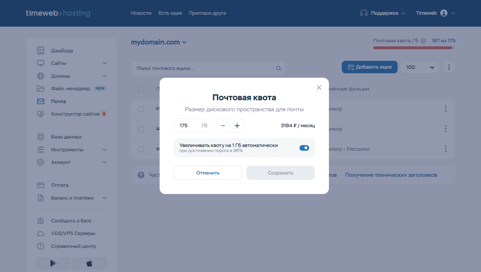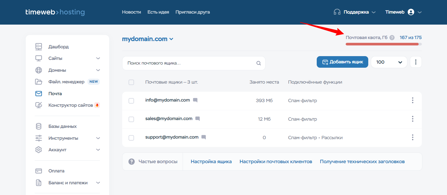 Почтовая квота — это дисковое пространство на сервере, выделенное под вашу почту. Клиентам виртуального хостинга по умолчанию предоставляется от 10 до 20 ГБ под почту, в зависимости от тарифа. Если вам необходимо больше пространства, его можно увеличить в разделе «Почта».
