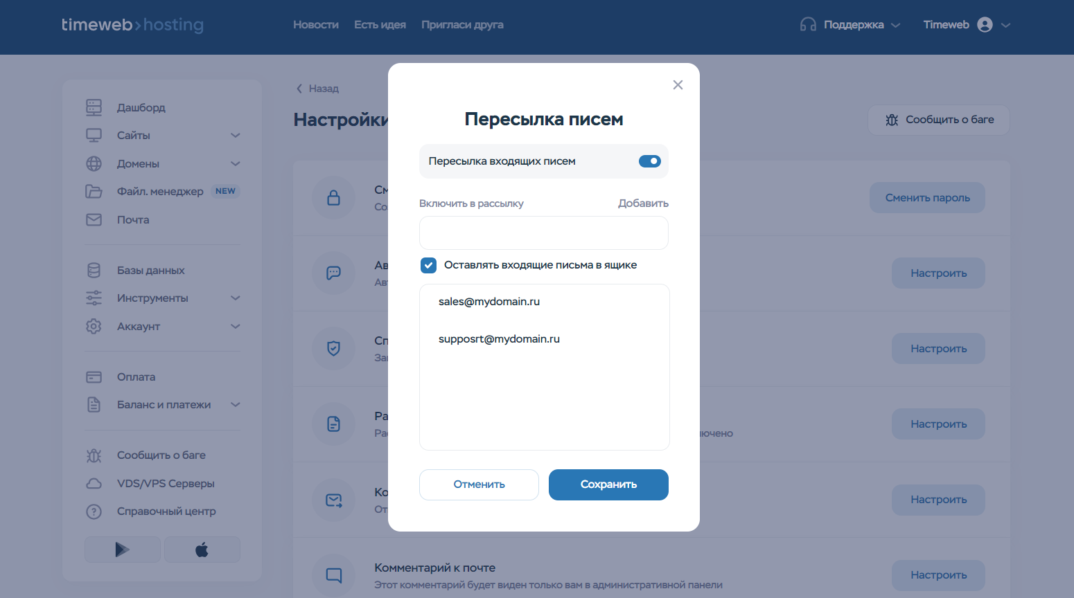 Если вам необходимо настроить пересылку только отдельных писем, это можно сделать через Timeweb Mail или интерфейс используемого почтового клиента.