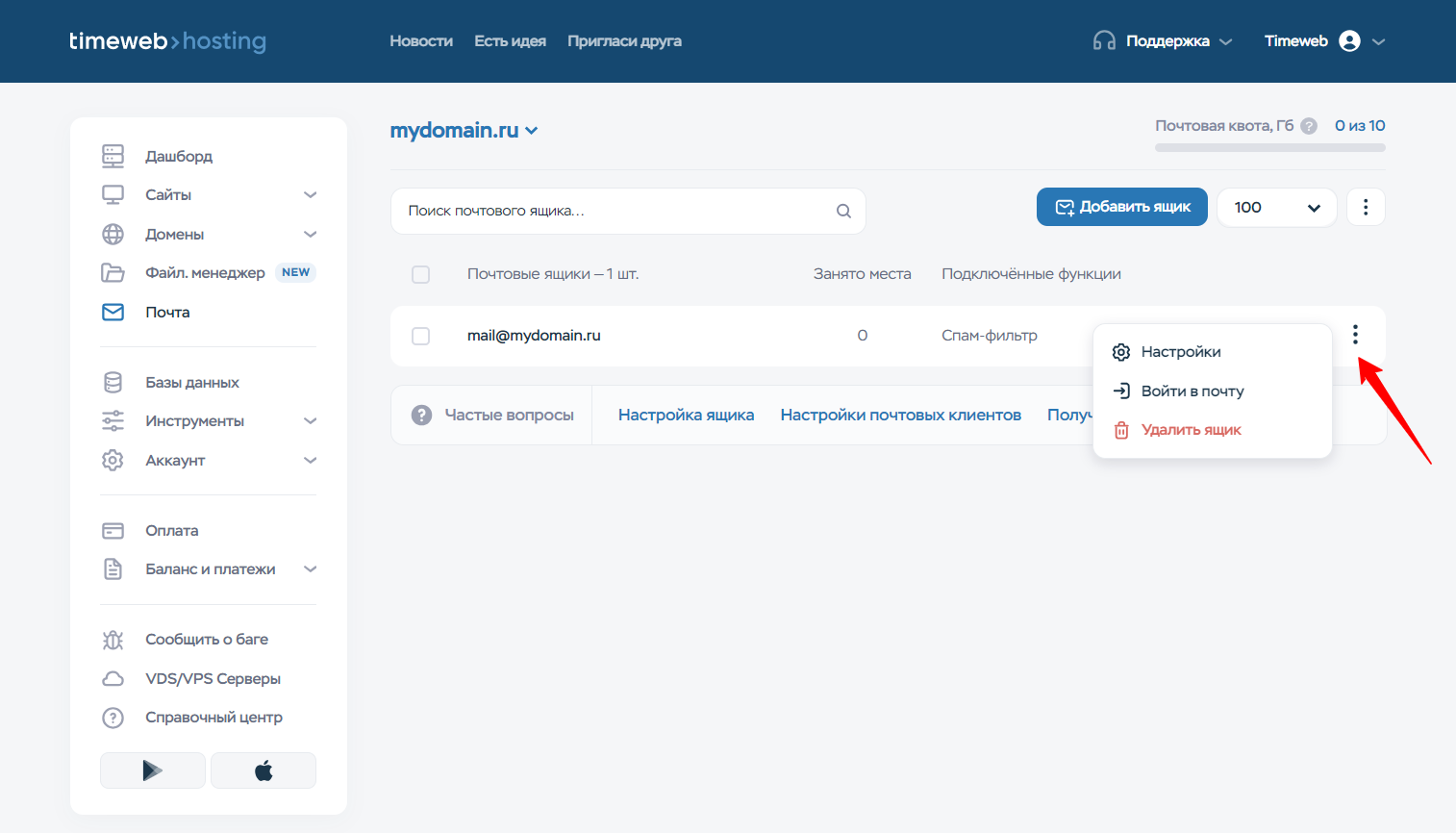 - Выберите нужный домен, если их у вас несколько, кликните на три точки у нужного ящика и выберите «Настройки».