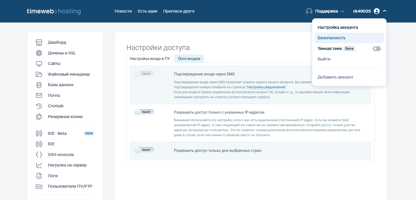 В разделе «Безопасность» вы можете установить следующие ограничения на доступ в панель управления: