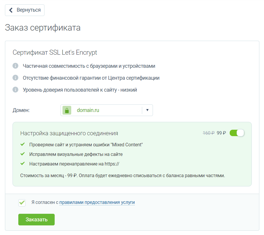 При заказе сертификата Let's Encrypt вы также можете приобрести услугу «Настройка защищенного соединения», в рамках которой мы обеспечим корректную установку и настройку сертификата.