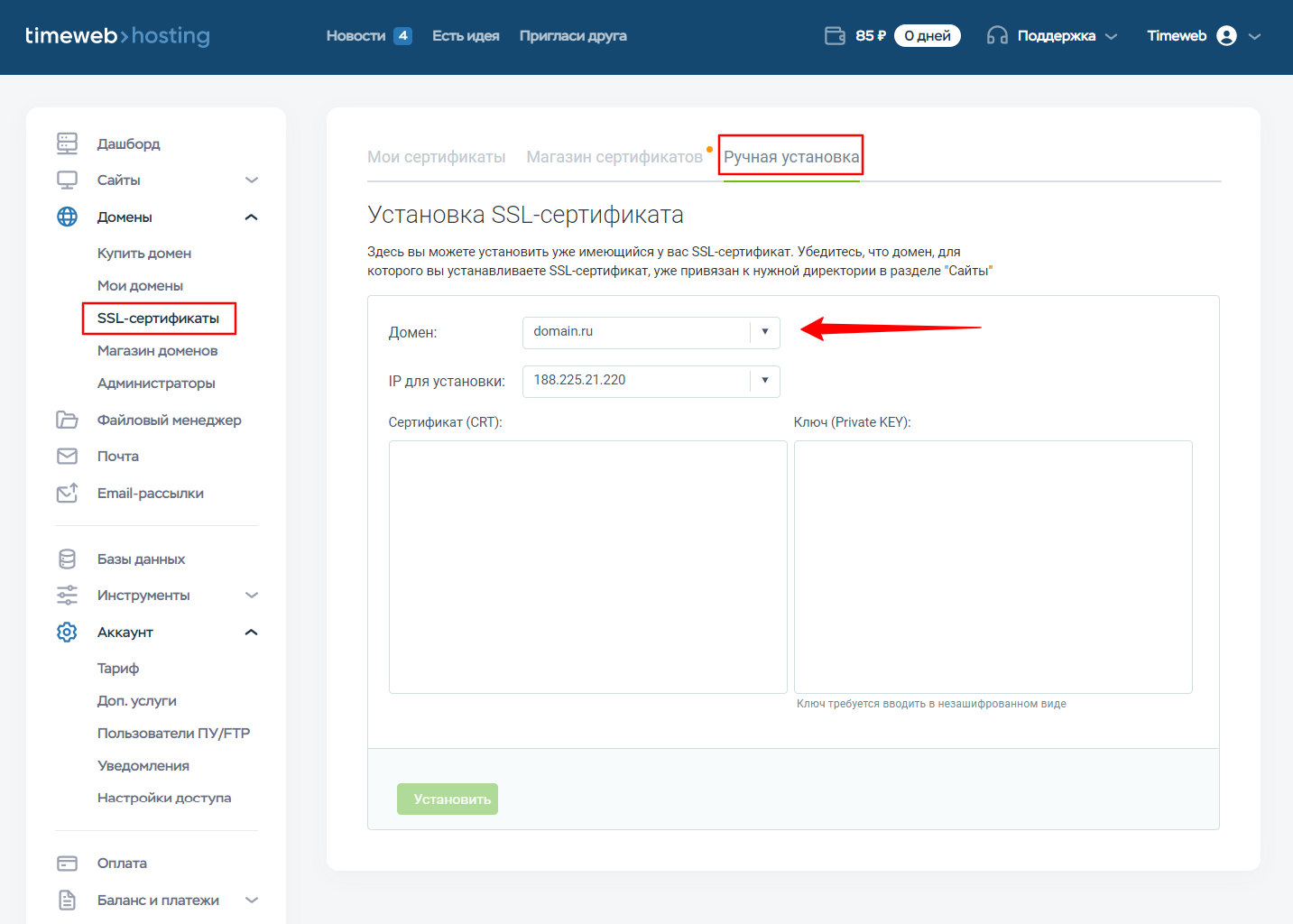 - Перейти в раздел «Домены» — «SSL-сертификаты» на вкладку «Ручная установка».