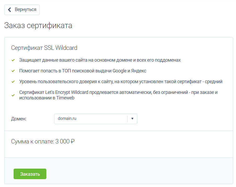 Для AlphaSSL, DomainSSL Wildcard и SSL Timeweb Pro также доступно автоматическое продление.