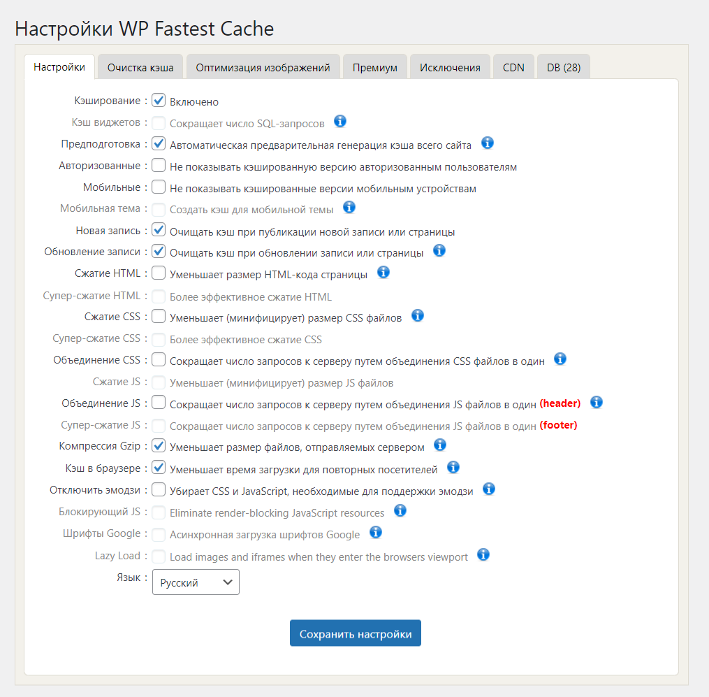 Вы можете использовать и другие опции плагина. Информацию о каждой из них можно найти, кликнув на значок вопроса рядом с опцией. Имеет смысл включать их последовательно и проверять работу сайта ориентировочно в течение суток, чтобы вовремя отследить нежелательный эффект, если он возникнет, и отключить конкретную опцию.