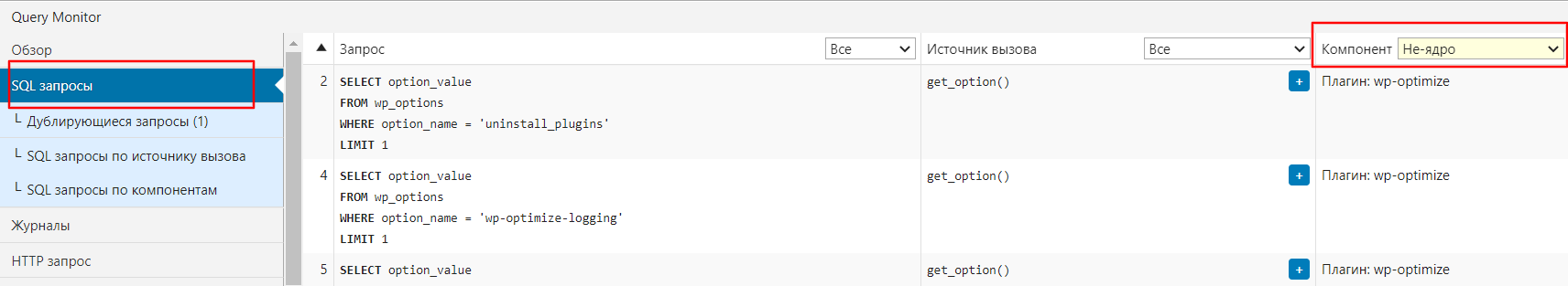 Установите и активируйте плагин, после чего перейдите на сайте и пролистайте его страницы (главную страницу и разделы, где наблюдается медленная работа). В верхнем меню будет отображаться скорость загрузки. Наведите курсор на этот элемент и в выпадающем меню выберите «SQL-запросы». В столбце «Компонент» выберите пункт «Не-ядро».