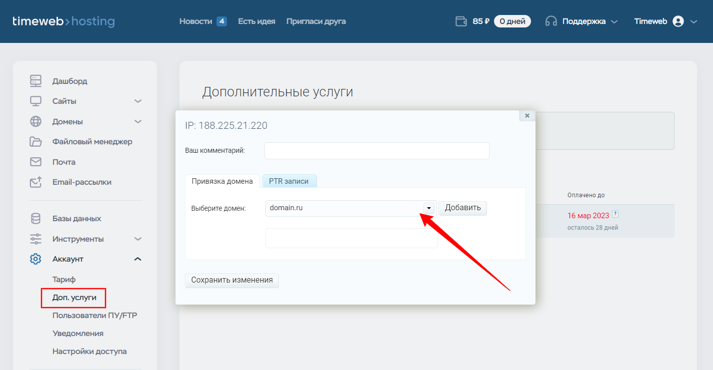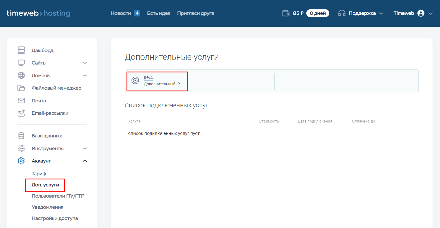 Дополнительный IP-адрес предоставляется только для размещения на нем сайтов и доменов. Вы можете активировать услугу в панели управления аккаунтом на срок от 1 месяца.