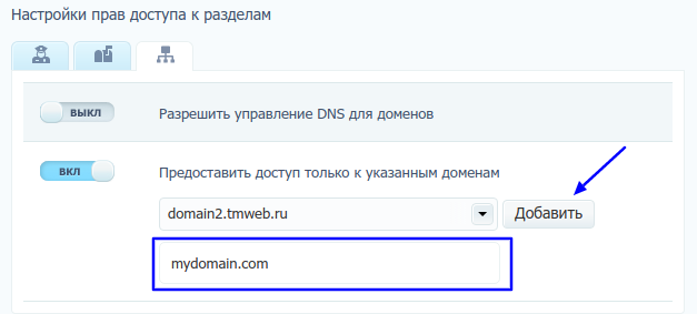 Также можно ограничить список доменов, управление которыми доступно пользователю. Для этого выберите домен из списка и нажмите «Добавить». Добавленные домены будут перечислены под выпадающим списком. Например, в данном случае пользователь может управлять только доменом mydomain.com: