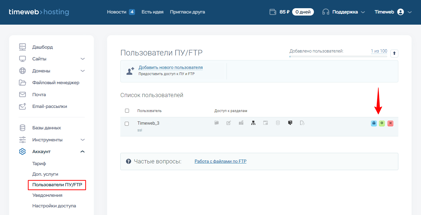 - Перейдите в раздел «Аккаунт» — «Пользователи ПУ/FTP».
