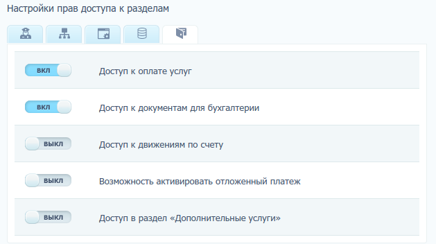 - опция «Финансы и документы» → «Доступ к оплате услуг» и «Доступ в раздел "Дополнительные услуги"».