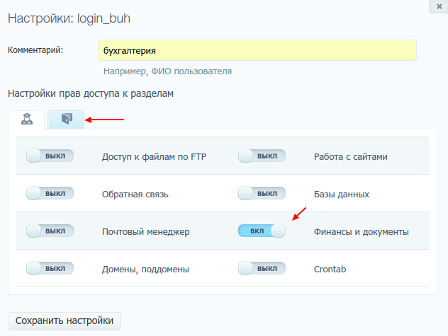 - Отметьте разделы, к которым нужно дать доступ. На вкладках сверху, которые отобразятся при выборе того или иного раздела, можно указать дополнительные настройки. Подробнее о настройках доступа — в разделе ниже.