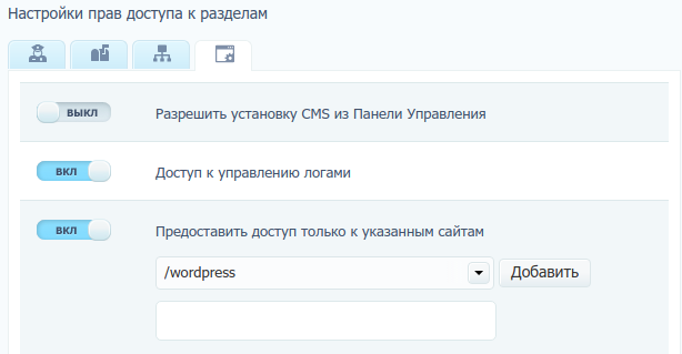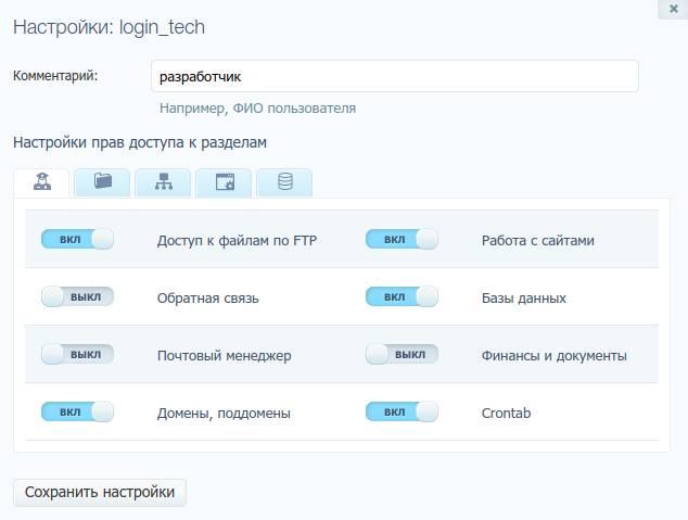Для каждого подраздела, кроме Crontab, можно указать дополнительные параметры: например, указать, с каким сайтом, базой, директорией может работать данный сотрудник, а также разрешить управление DNS-записями доменов при необходимости.