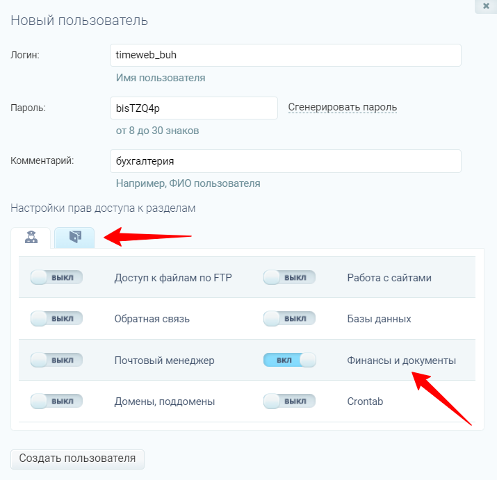 - Нажмите «Создать пользователя».