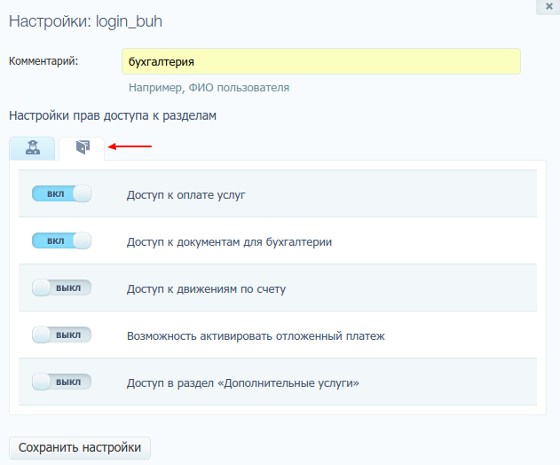 И на появившейся вкладке настроить нужные доступы, например, возможность выставления счетов и получения электронных документов: