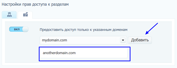 Можно ограничить доступ конкретными доменами. Для этого выберите домен из списка и нажмите «Добавить». Добавленные домены будут перечислены под выпадающим списком.