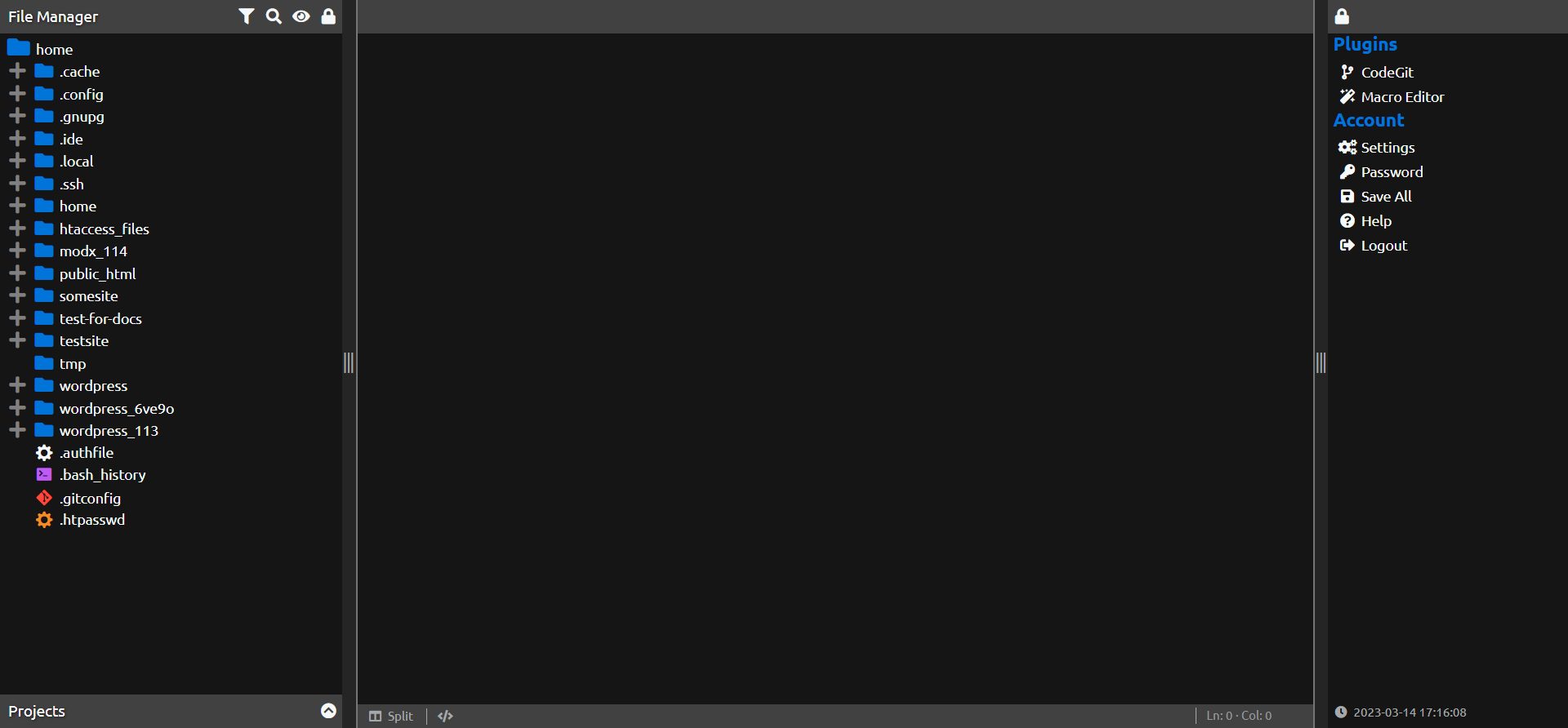 - менеджер файлов (слева) — здесь осуществляется навигация по каталогу аккаунта;