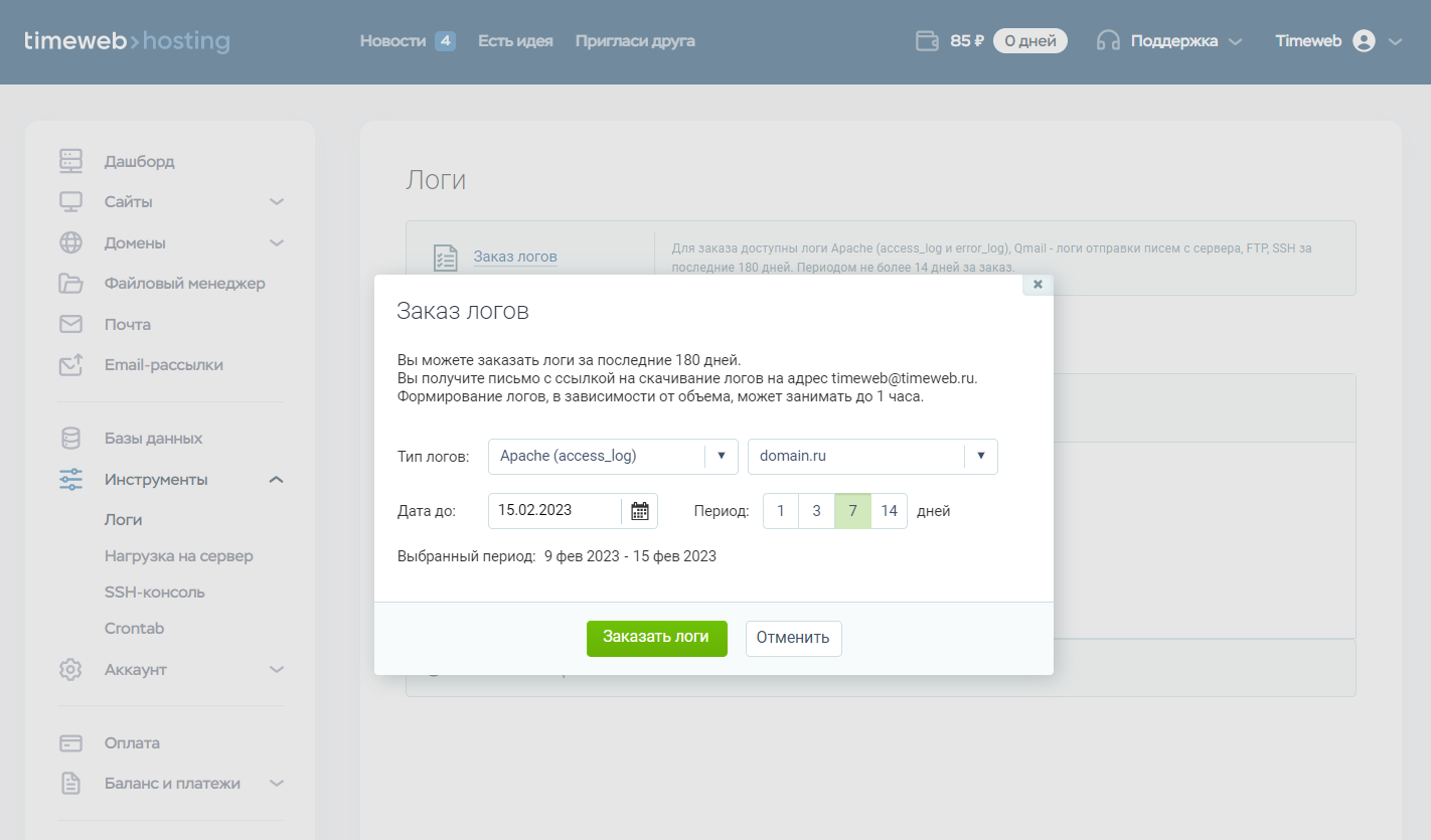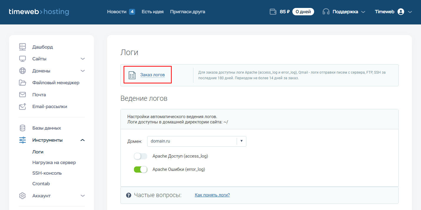 Включить ведение логов или заказать логи за прошлый период вы можете в панели управления в разделе «Инструменты» — «Логи».