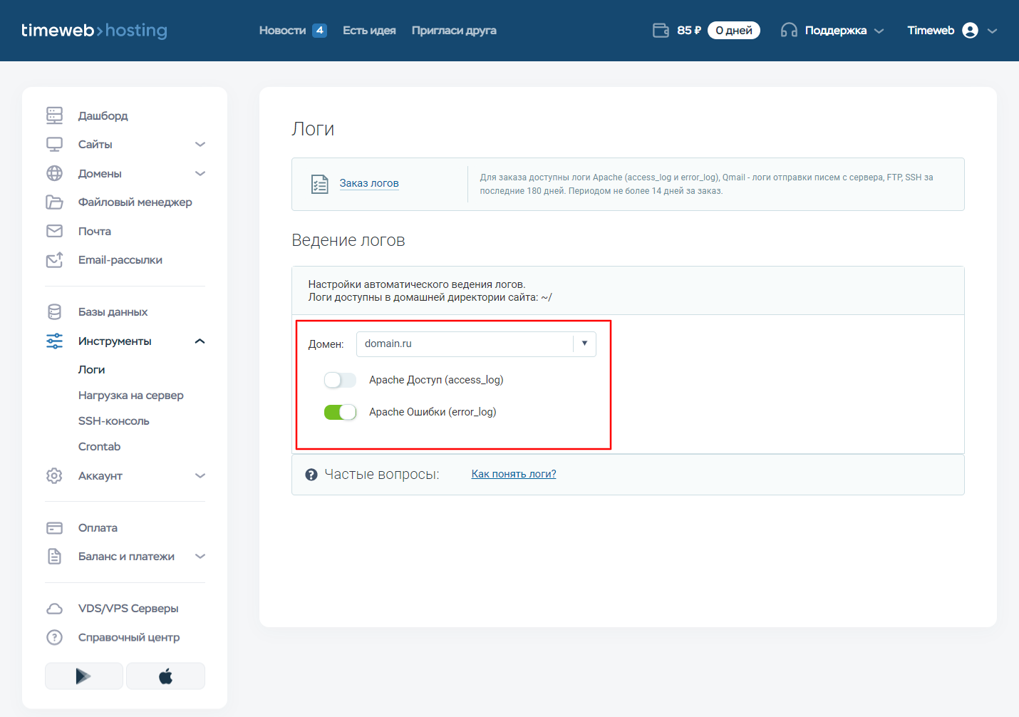 Для этого перейдите в раздел «Инструменты» — «Логи», выберите в блоке «Ведение логов» необходимый домен и включите нужный тип лога.