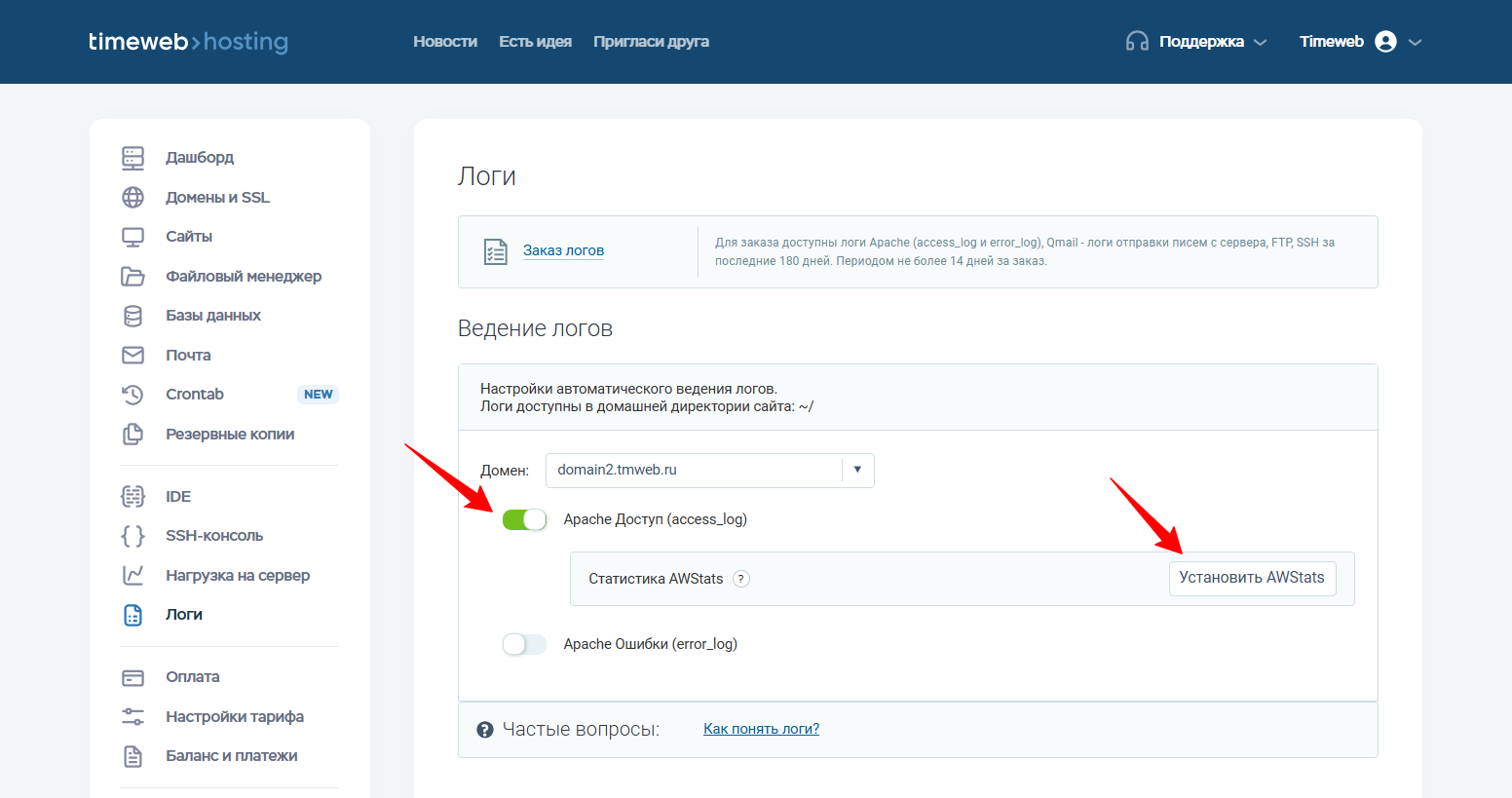 Для этого выберите домен сайта, для которого необходимо производить анализ статистики, включите лог доступа (access_log) и нажмите на кнопку «Установить AWStats». Приложение будет установлено автоматически и доступно по адресу http://ваш_домен.ru/awstats/.