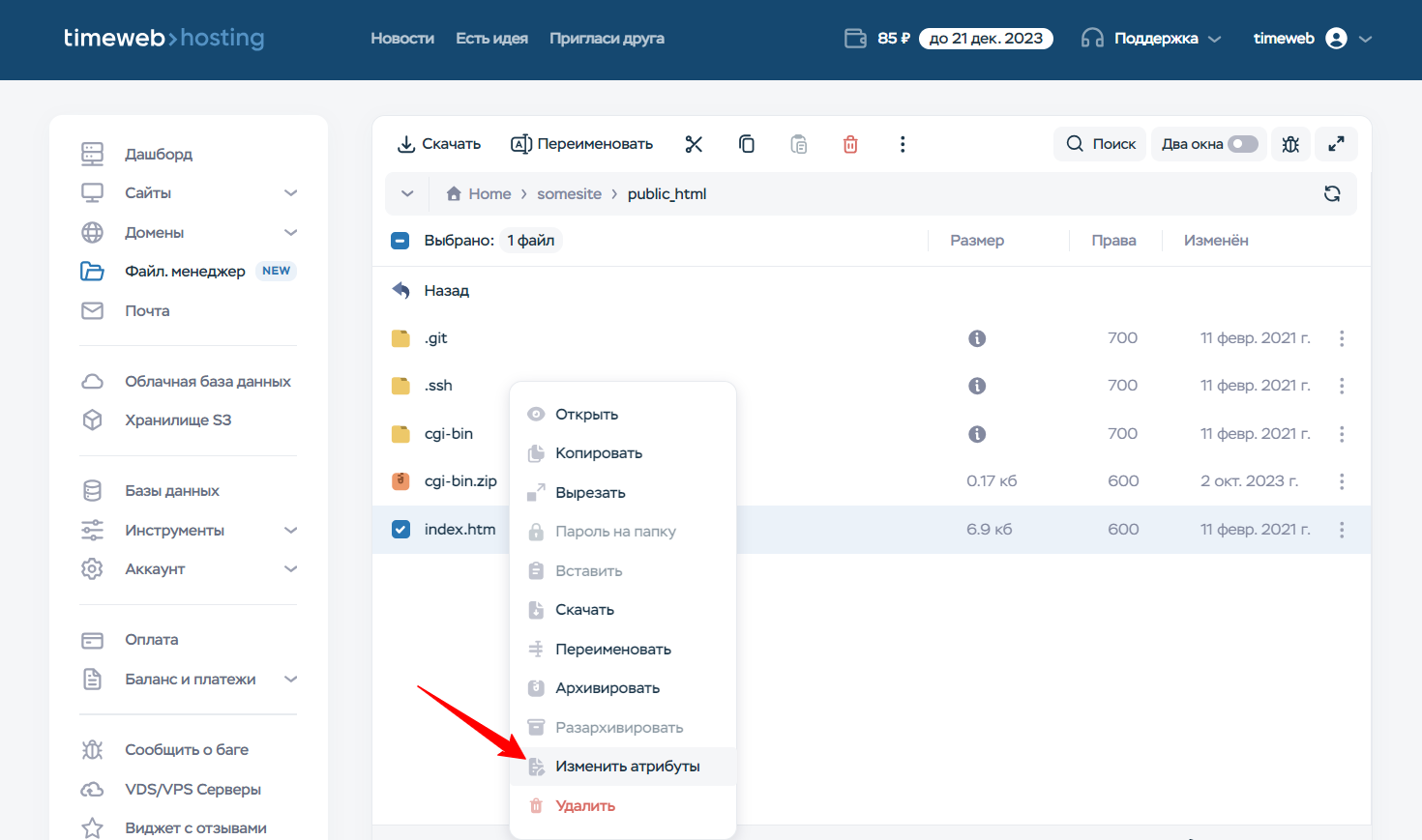 - Кликните на нужном файле или каталоге правой кнопкой мыши (указать права одновременно для нескольких файлов/директорий невозможно).