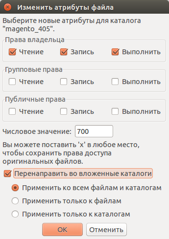 - Задайте нужные права. При редактировании прав на каталог также есть возможность применить настройки к вложенным каталогам.