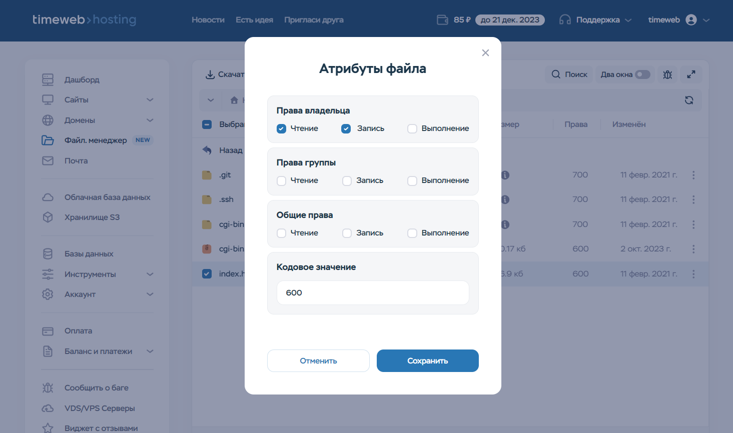 Настроить права доступа к файлам и директориям вы можете тремя способами: