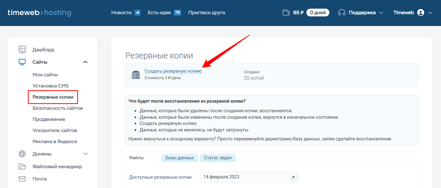 Чтобы создать резервную копию, перейдите в раздел панели управления «Сайты» — «Резервные копии» и нажмите «Создать резервную копию».