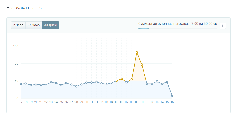 На графиках в панели управления (раздел «Инструменты» — «Нагрузка на сервер») можно увидеть динамику нагрузки за последние 2 часа / 24 часа / 30 дней. Превышение лимита будет отрисовано на графике желтым цветом.