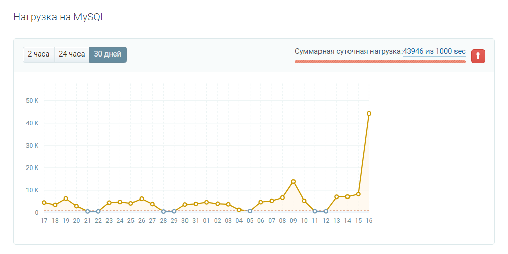 Нагрузка на MySQL — это время в секундах, суммарно затраченное на обработку запросов к базам данных аккаунта в течение суток. Нагрузка на MySQL измеряется при помощи специального модуля от Percona, входящего в используемую нами сборку MySQL. Документация о продукте доступна на сайте разработчика.
